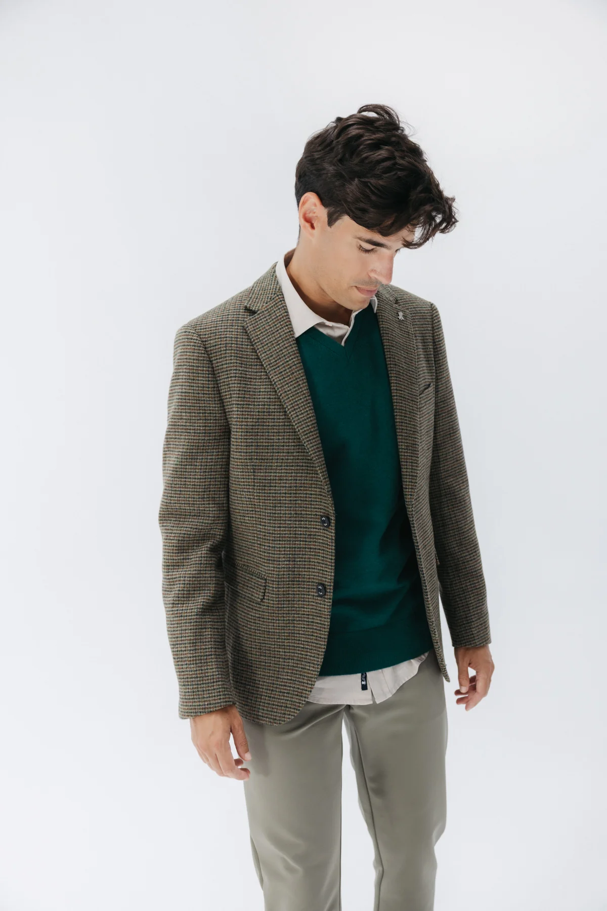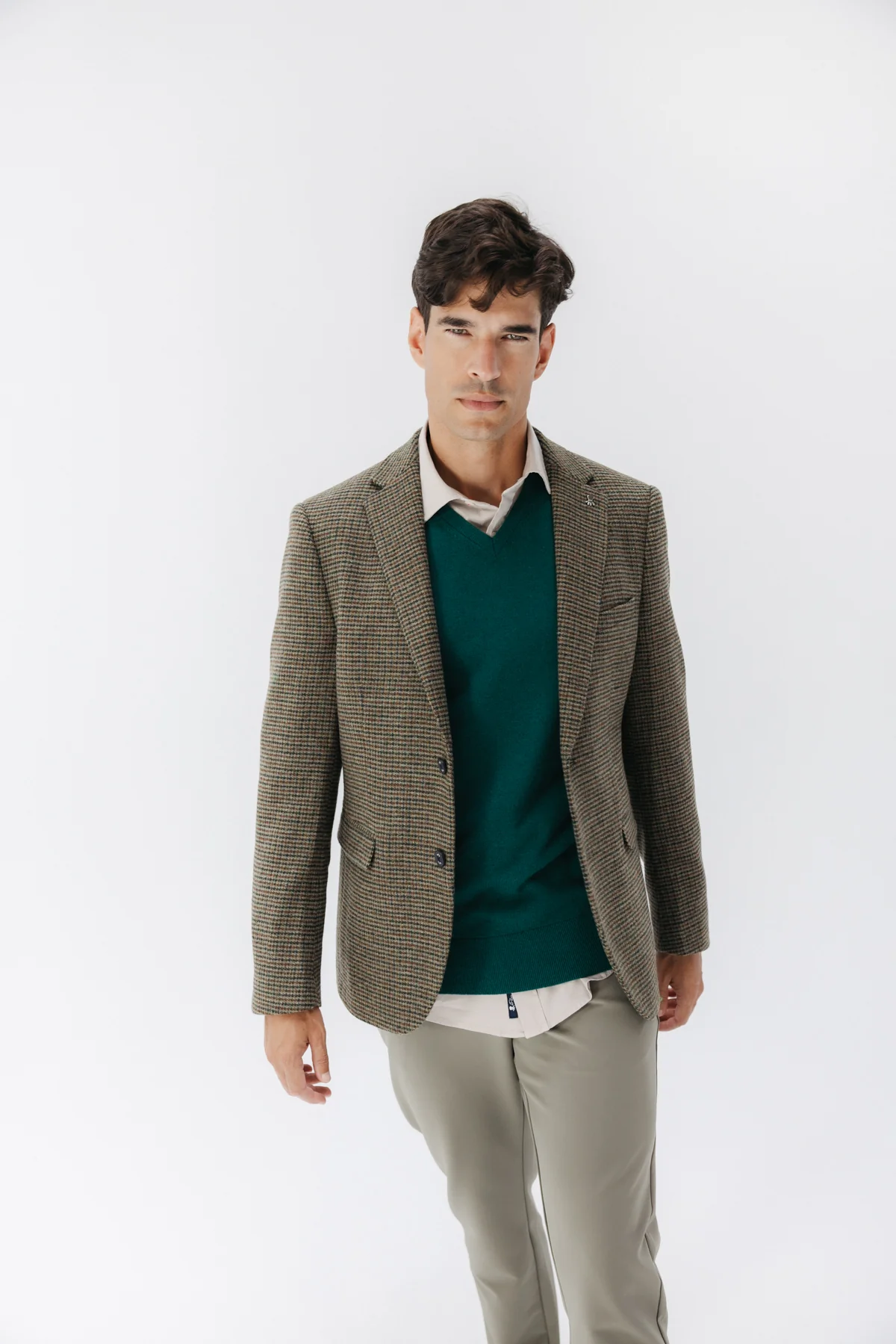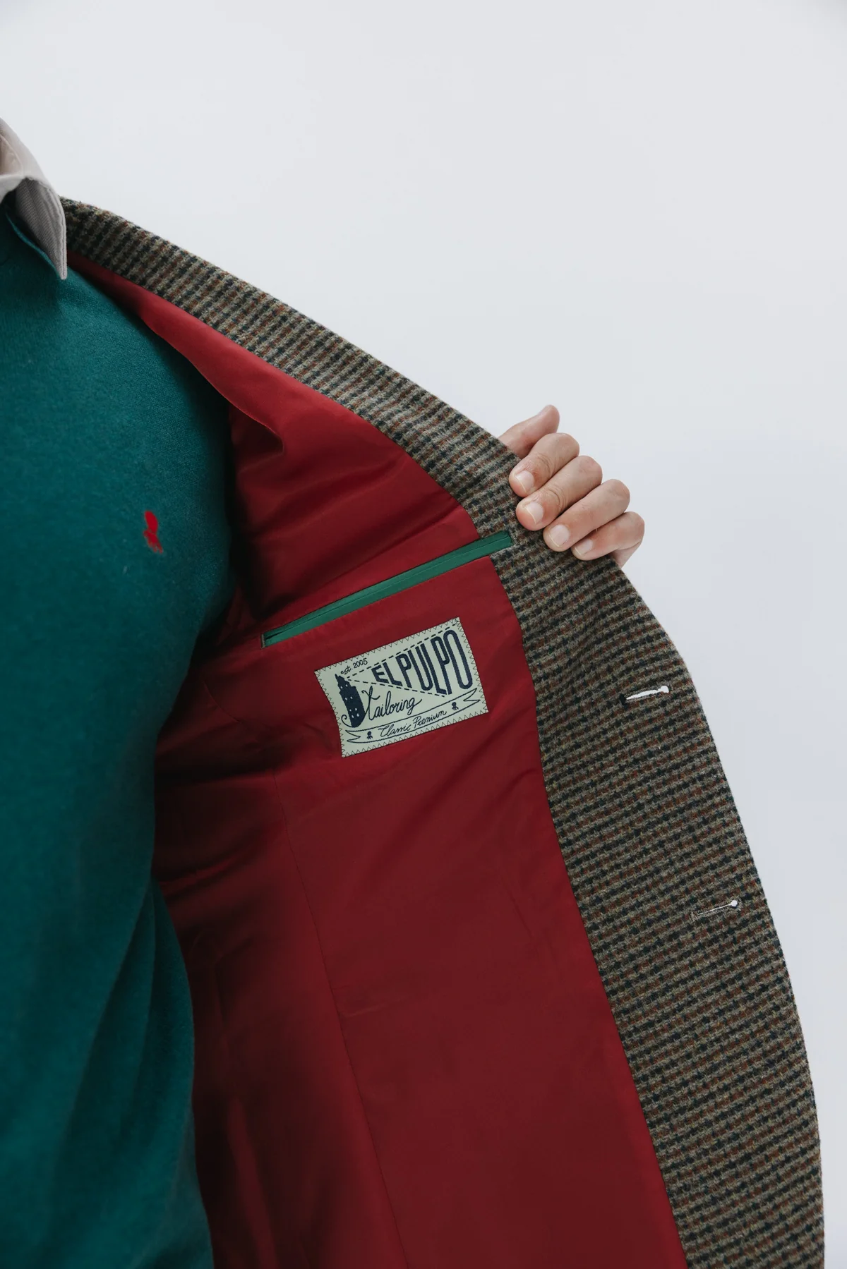 Americana para hombre confeccionada en 50% lana y 50% poliéster en color verde. Triple bolsillo delantero. Pin con logotipo elPulpo en solapa. Espalda con aberturas traseras.