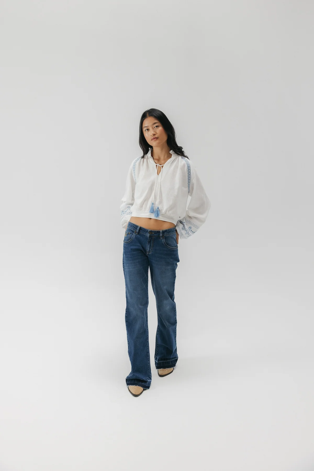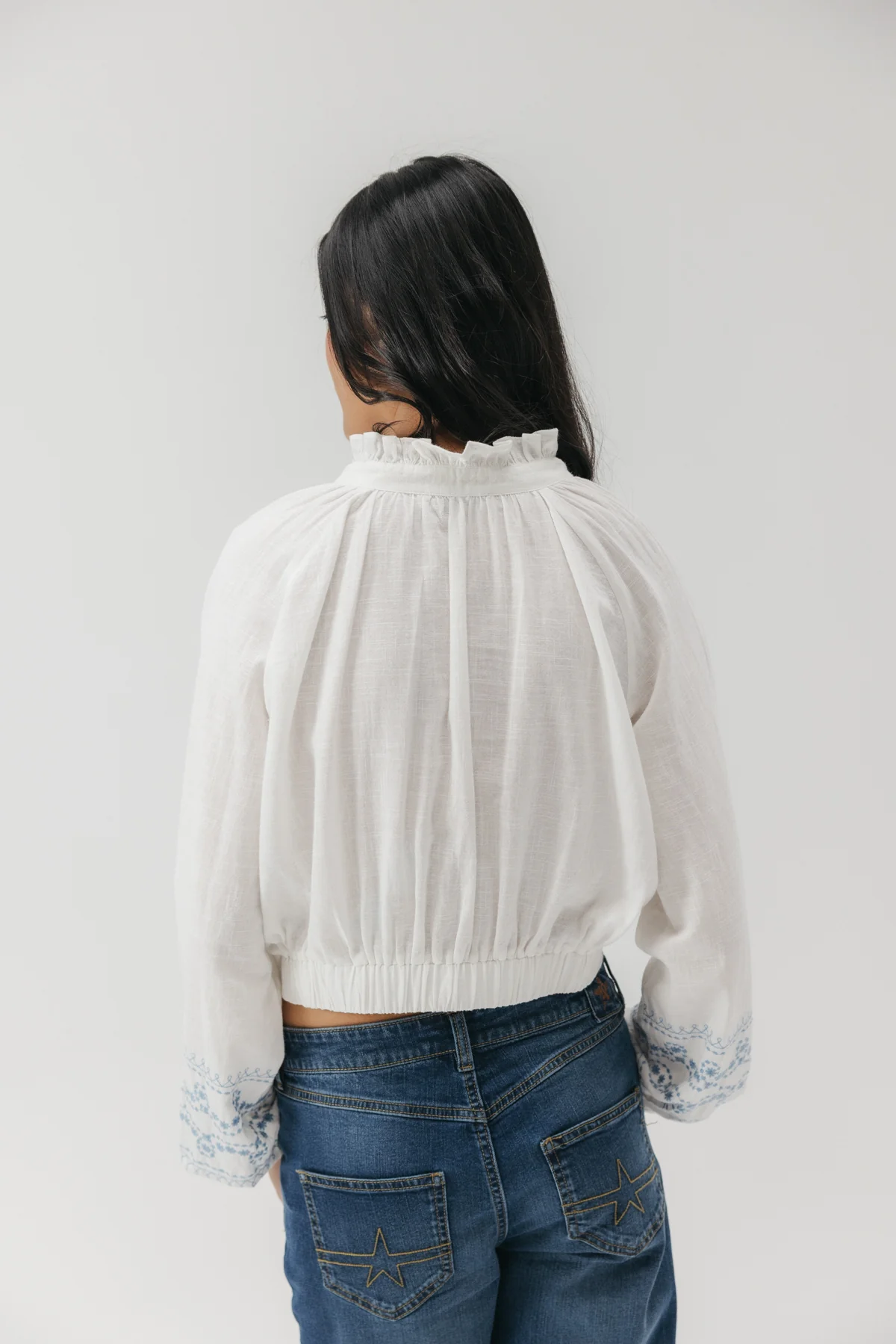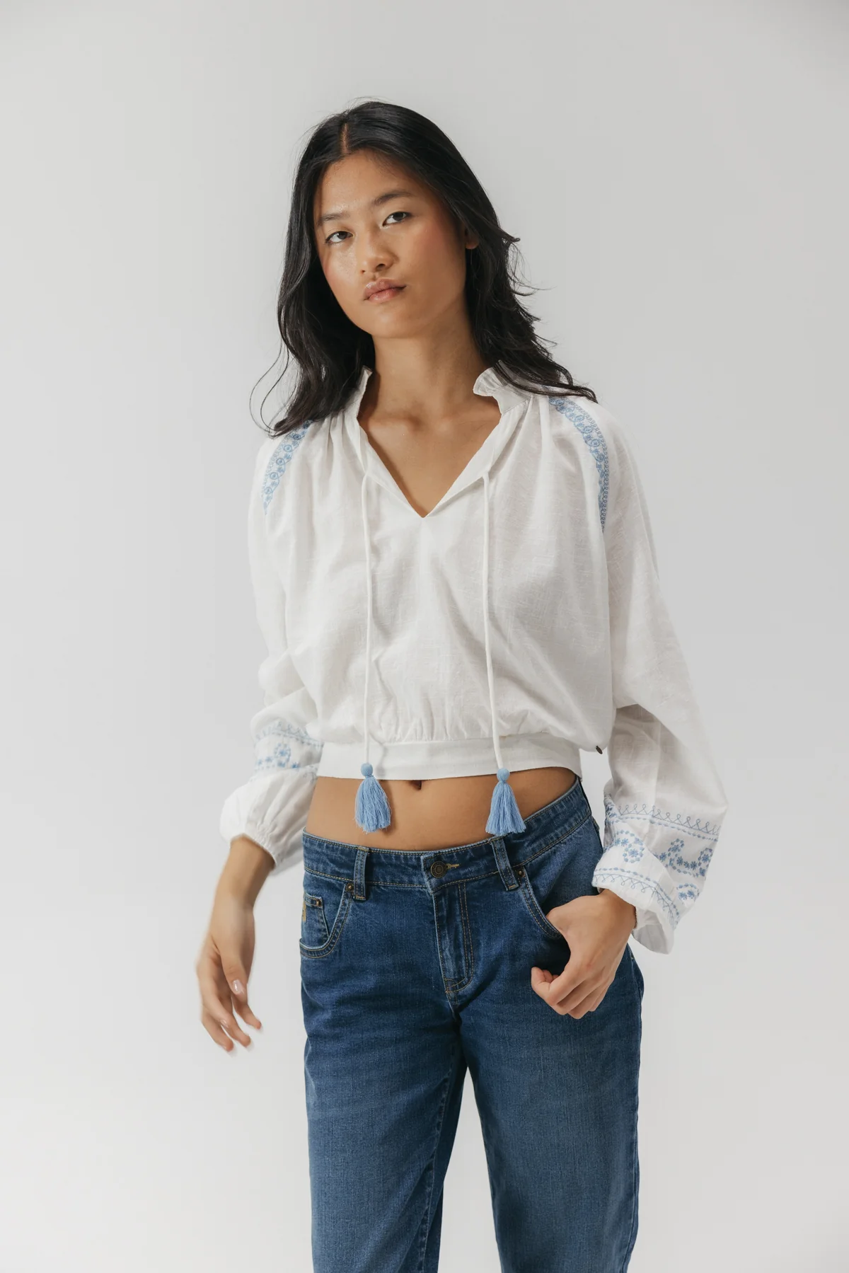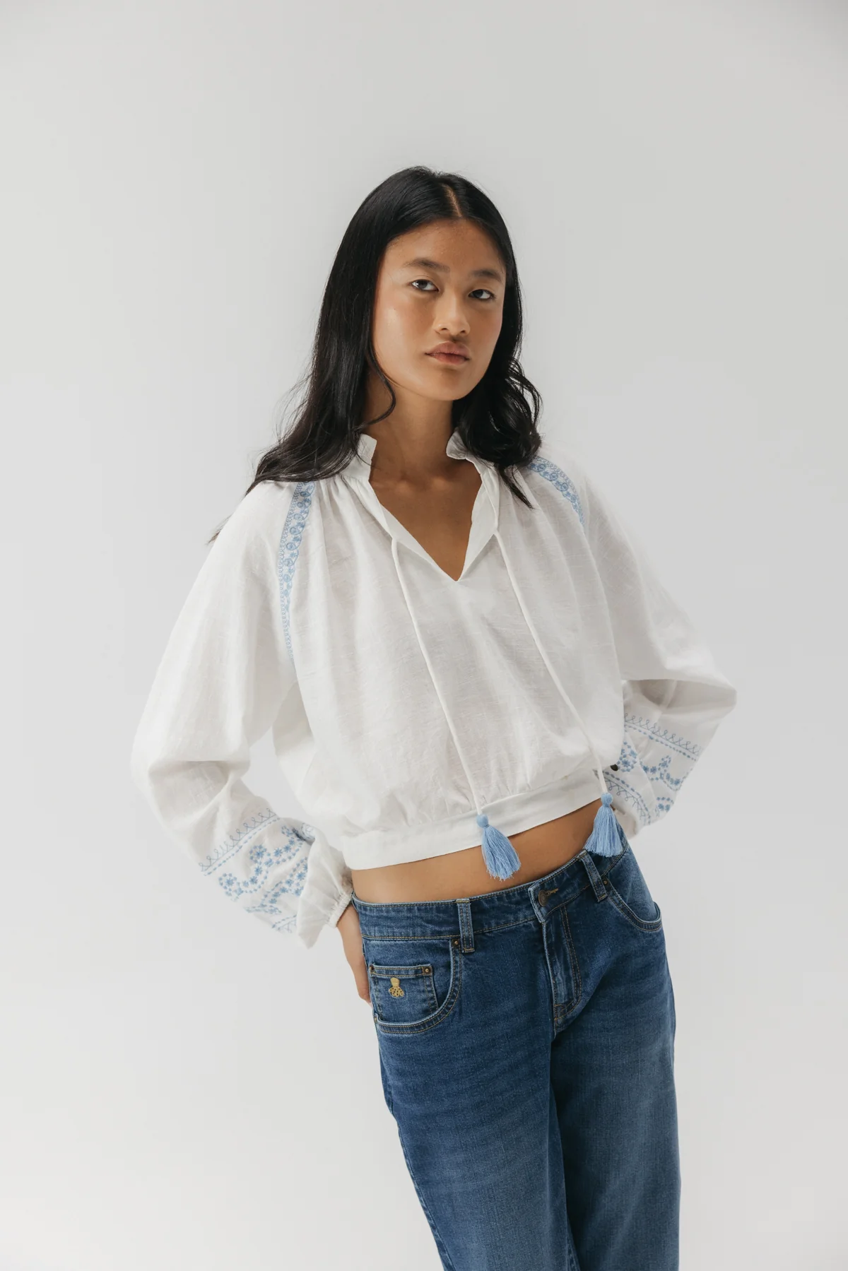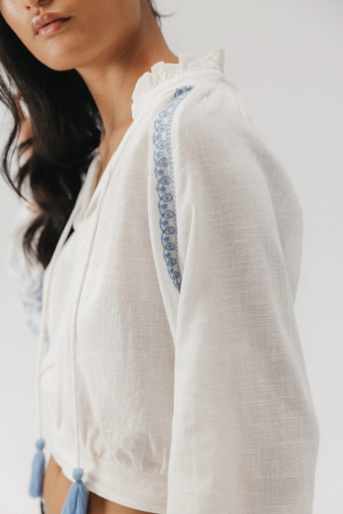 Blusa teen bordados en color blanco puro. Detalle bordados a contraste en azul en mangas y hombros. Confeccionada en 100% algodón y bordados en 100% poliéster. Cuello en pico ajustable con cordón acabado en pompón. Mangas abullonadas con elásticos en puños.