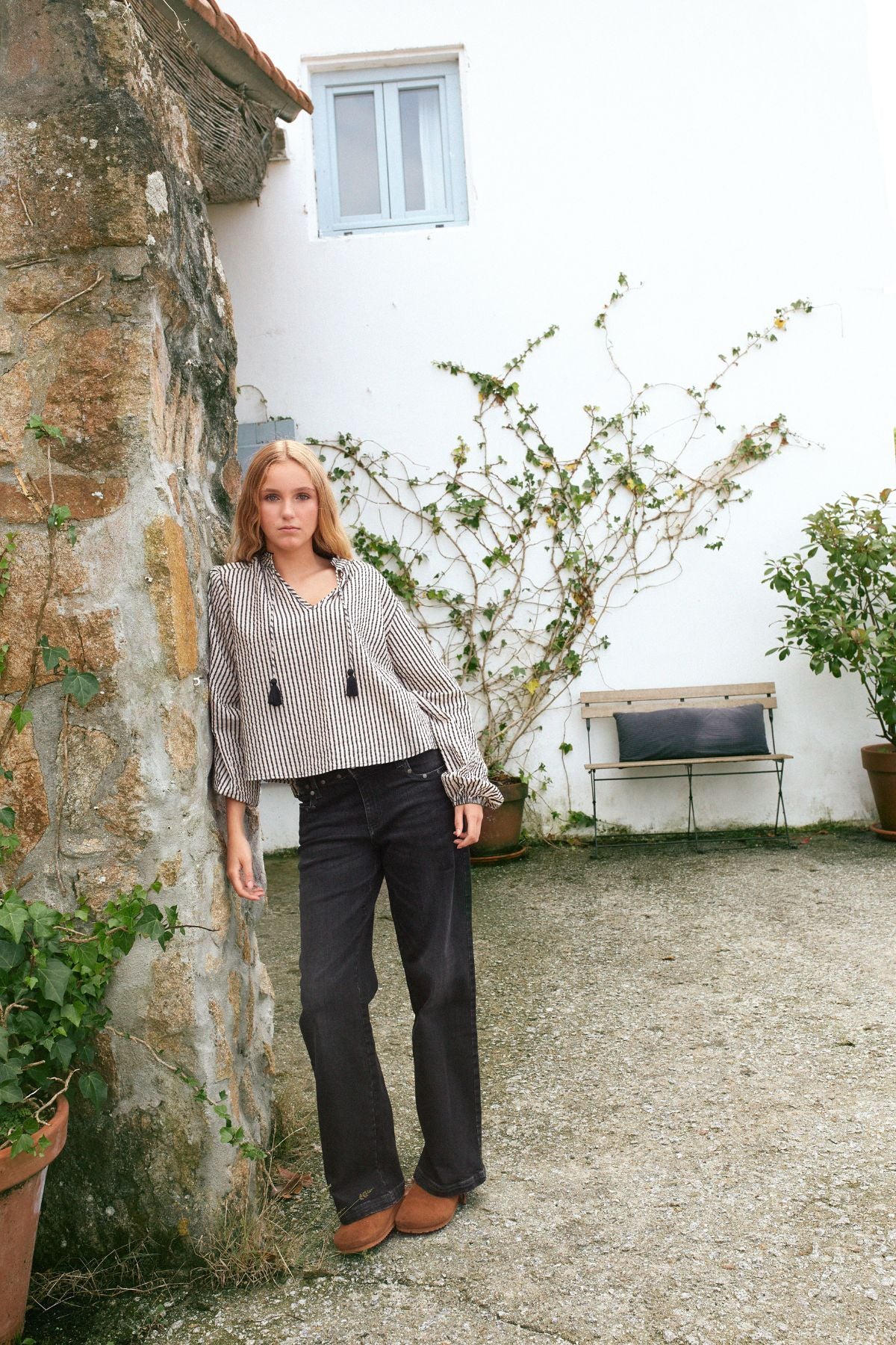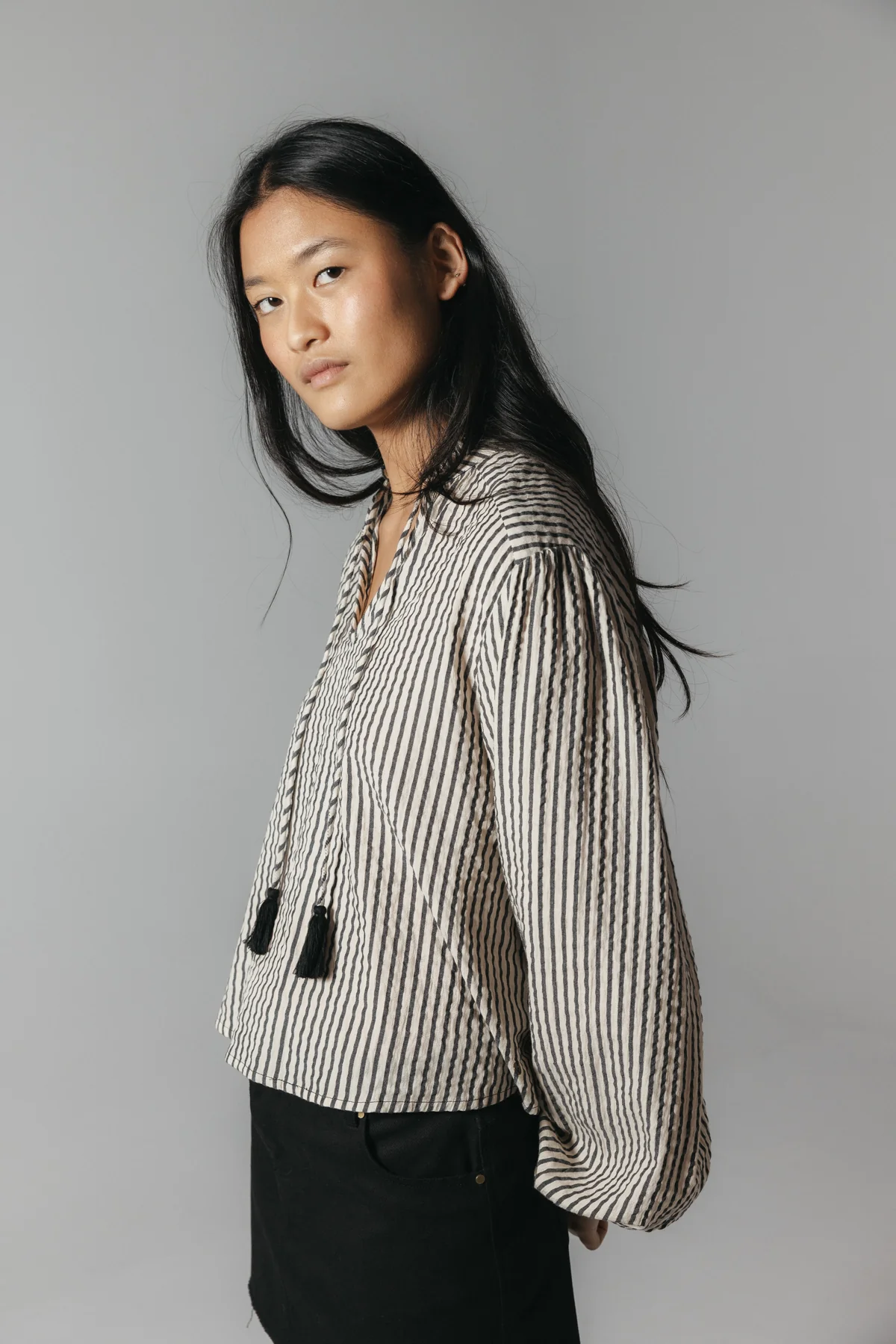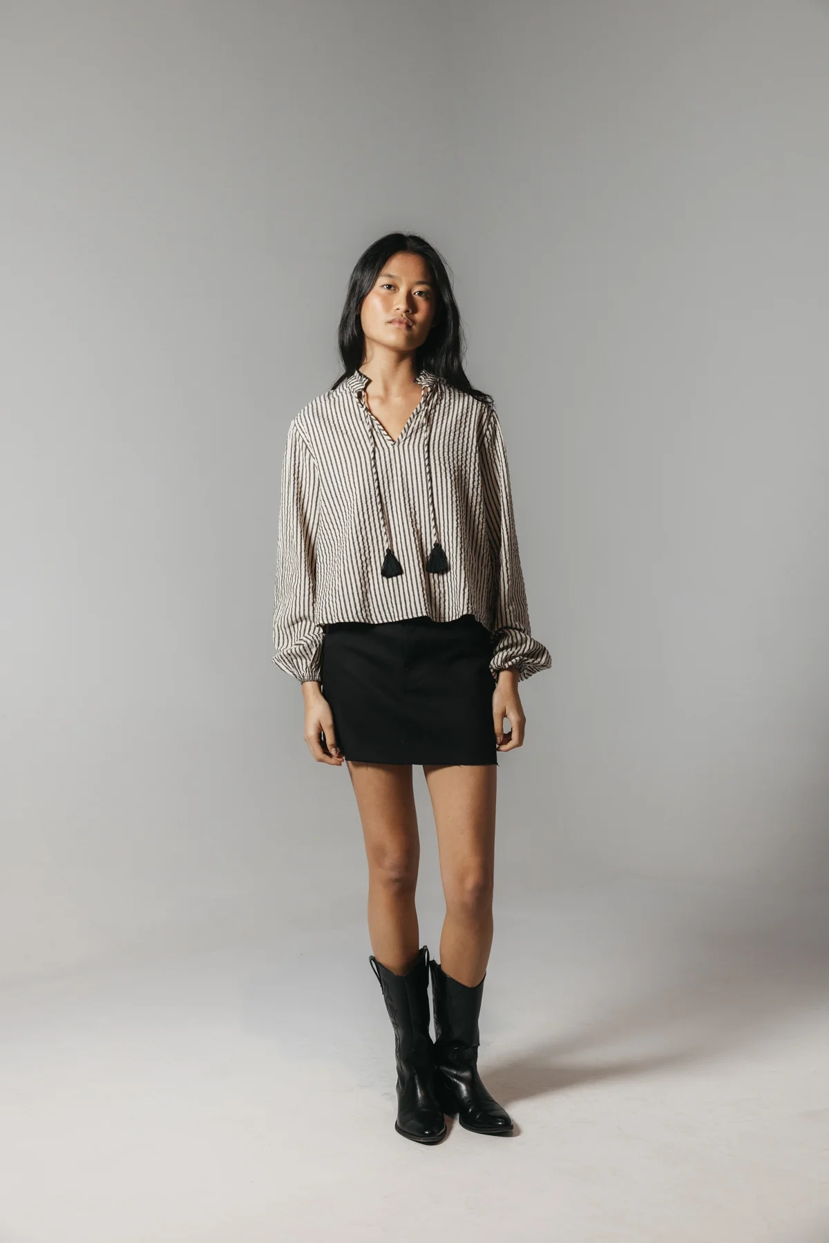 Blusa teen en color crudo y negro. Detalle de cordón con acabado en pompón a contraste. Cuello en pico. Mangas abullonadas con elásticos en los puños.