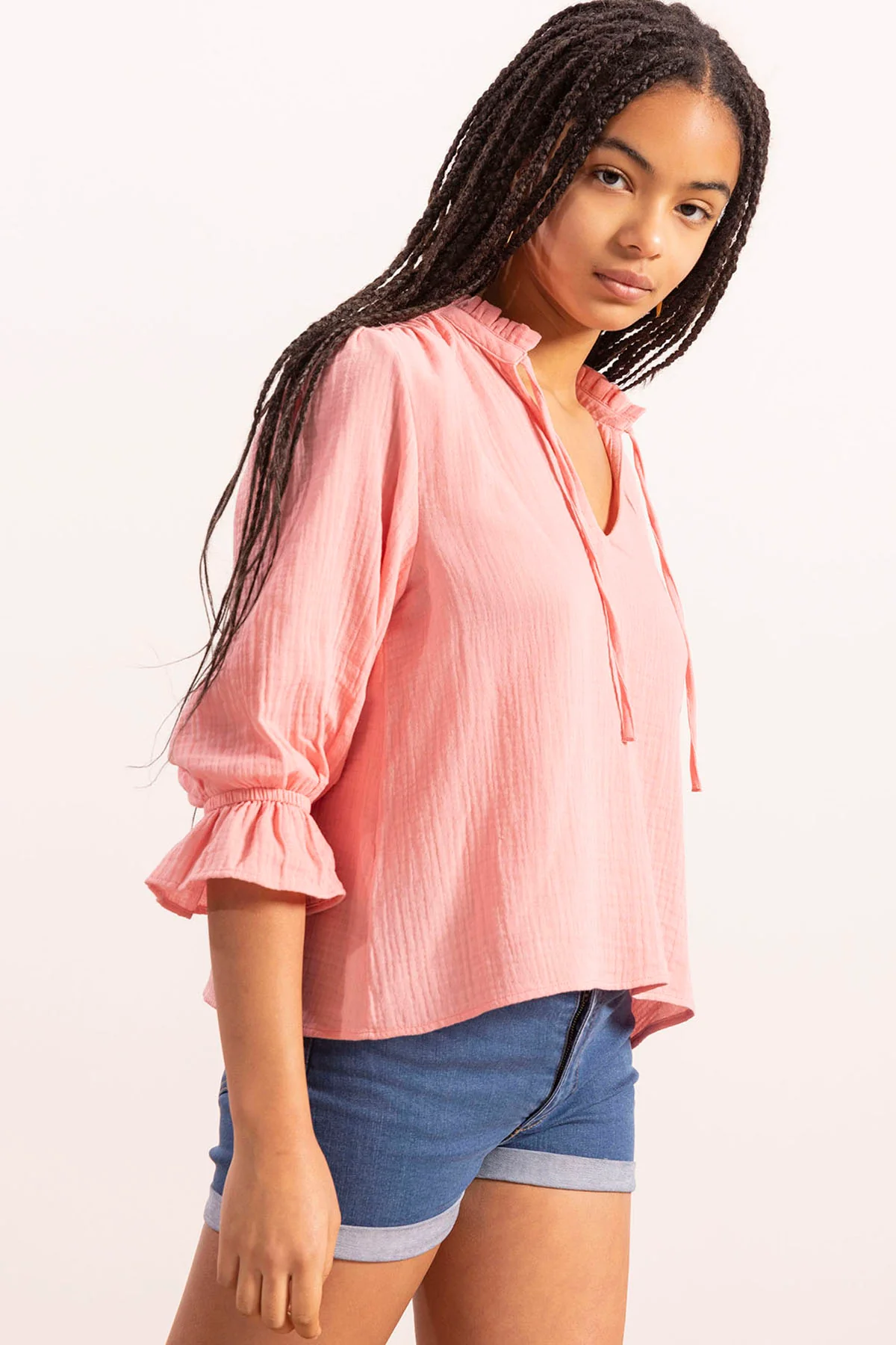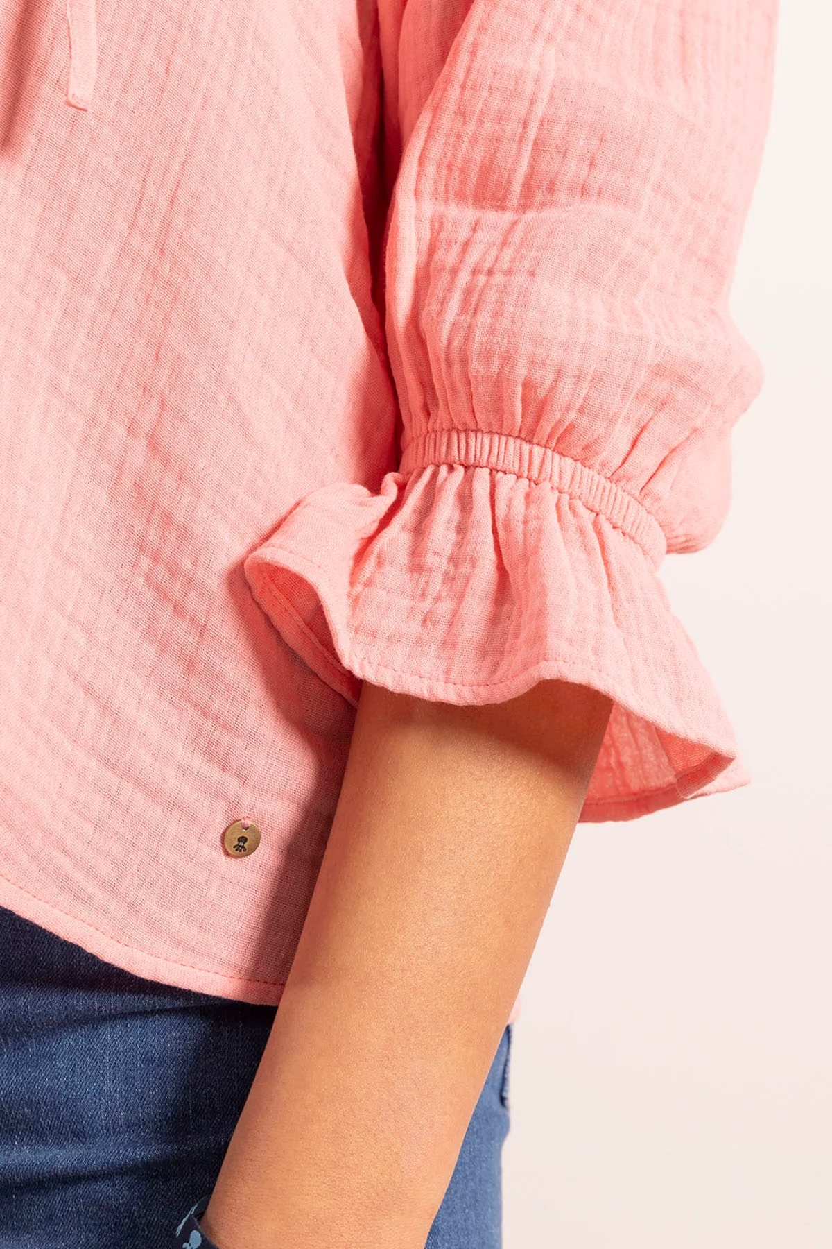 Blusa con escote pico bambula en color rosa empolvado. Cuello en pico con detalle volante y cordones. Mangas con volantes. Detalle chapa elPulpo en delantero izquierdo.