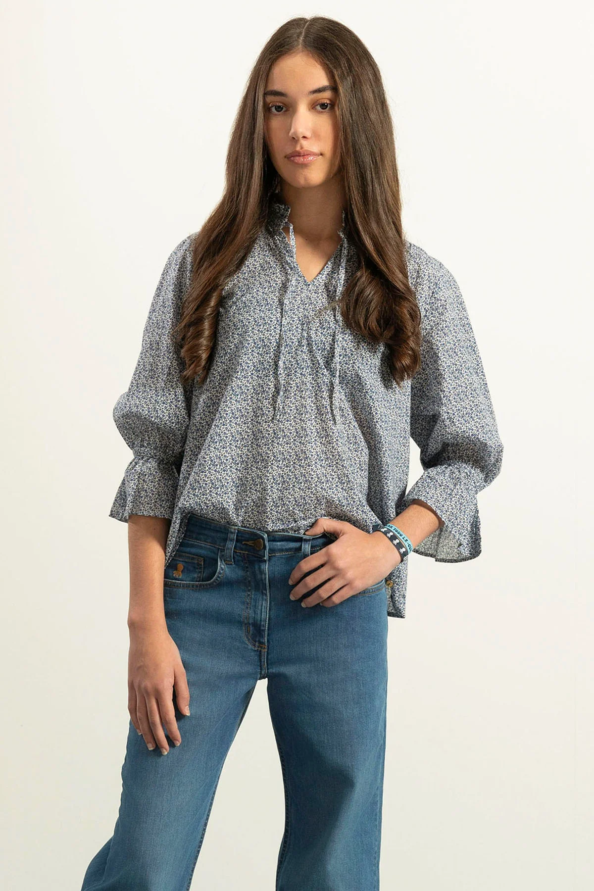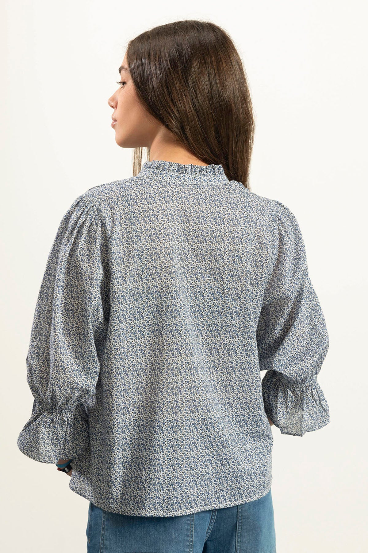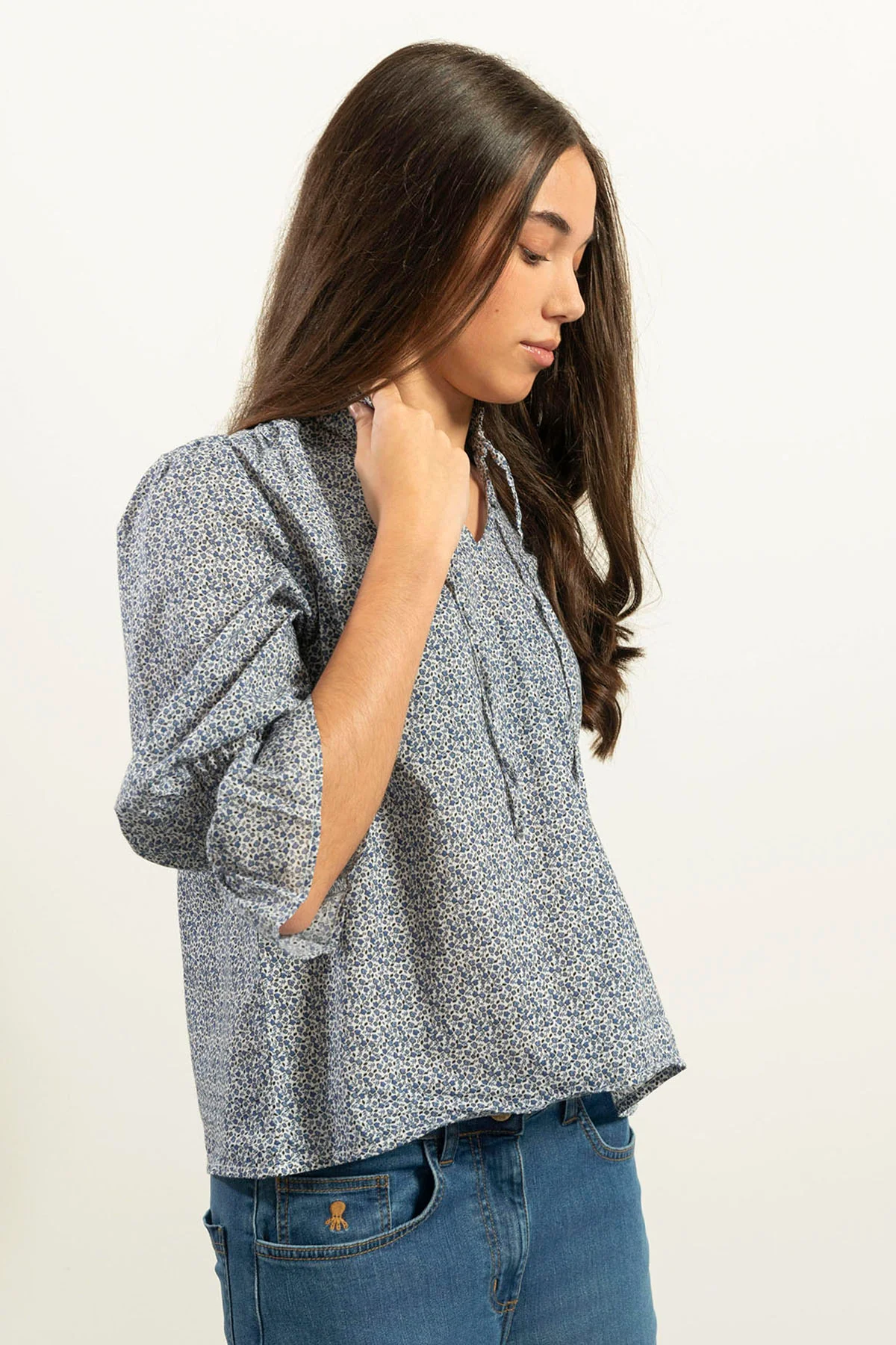 Camisa con estampado floral en azul marino. Abertura frontal con escote en pico y cordones decorativos. Manga tres cuartos con goma ajustada al brazo y volante final.