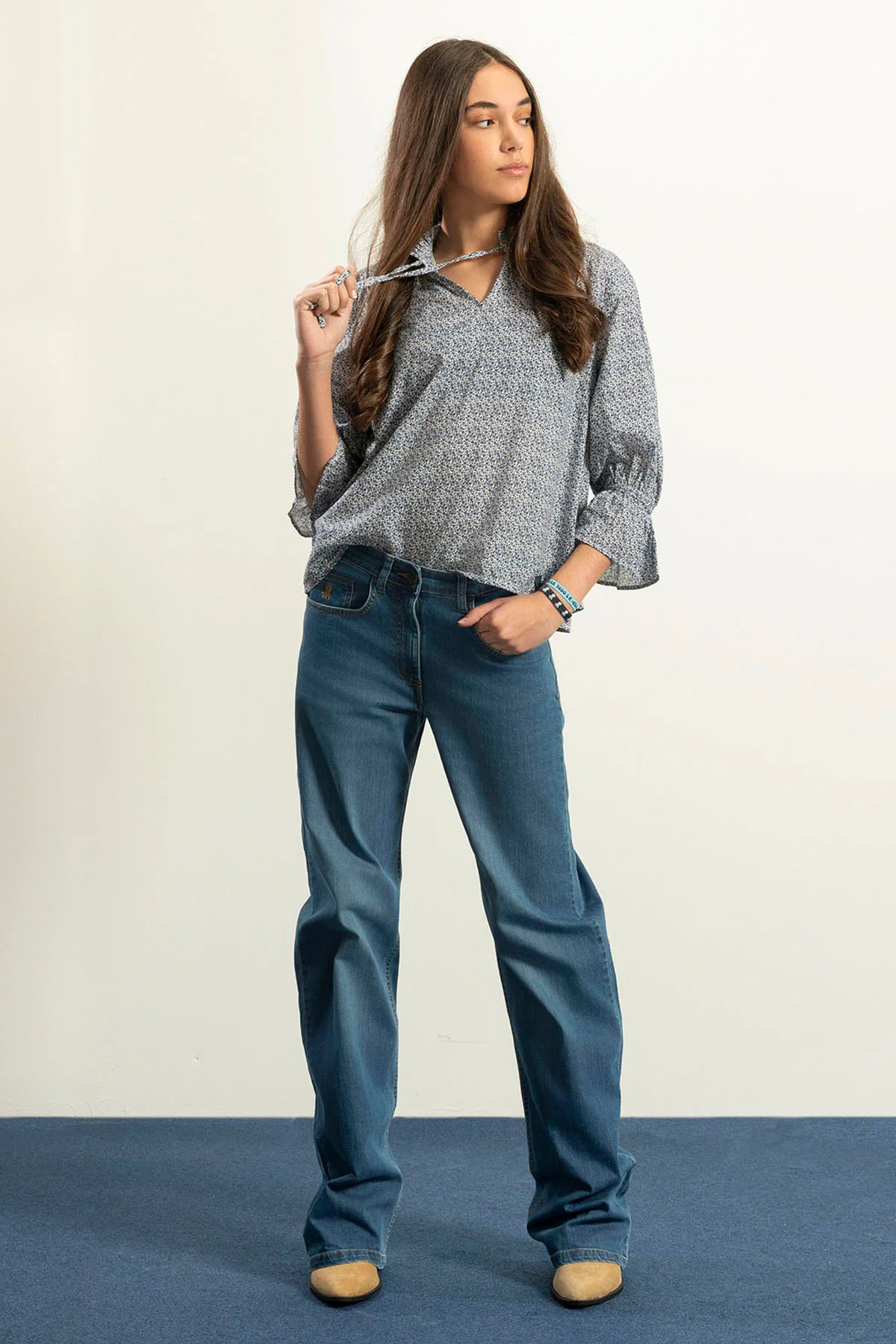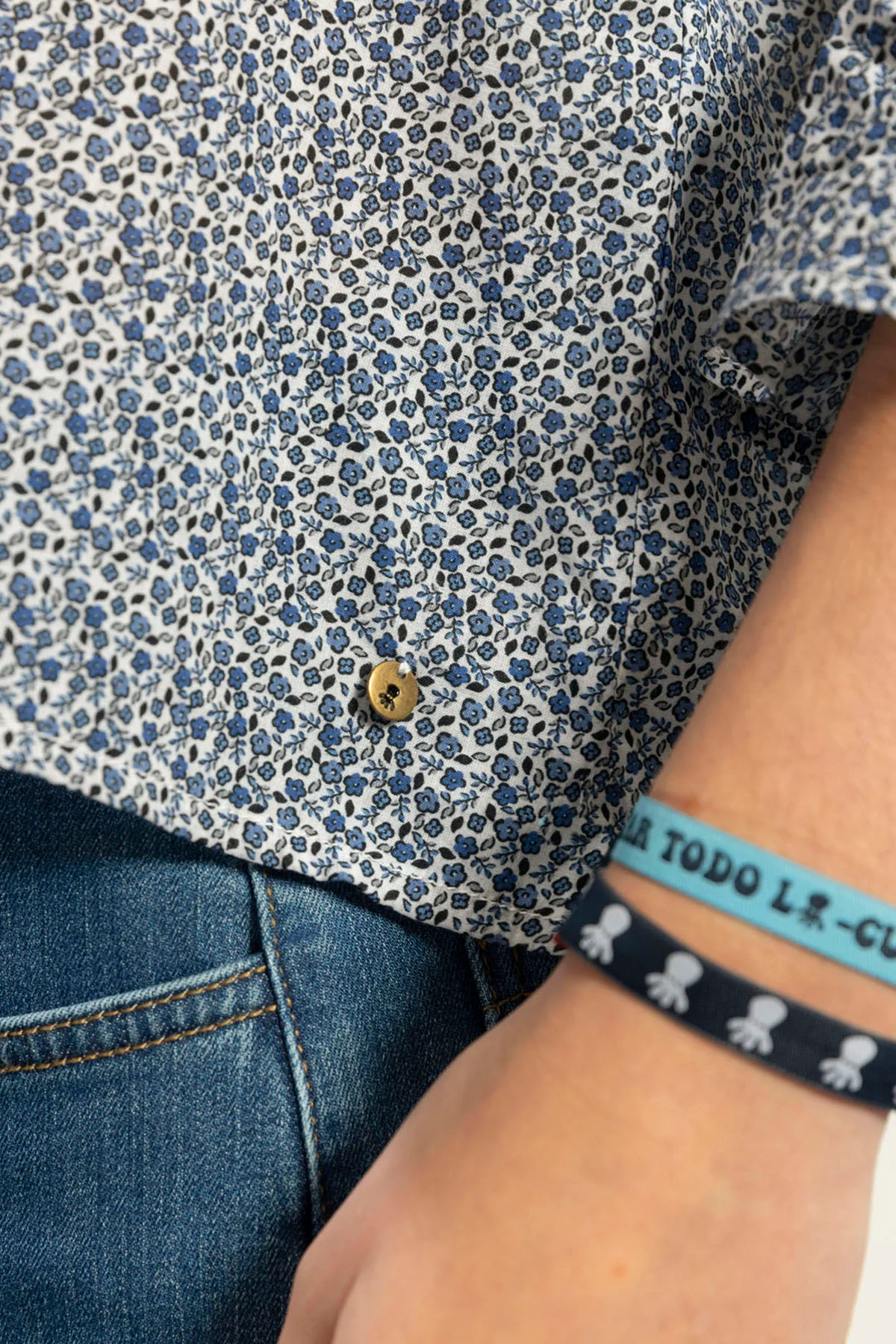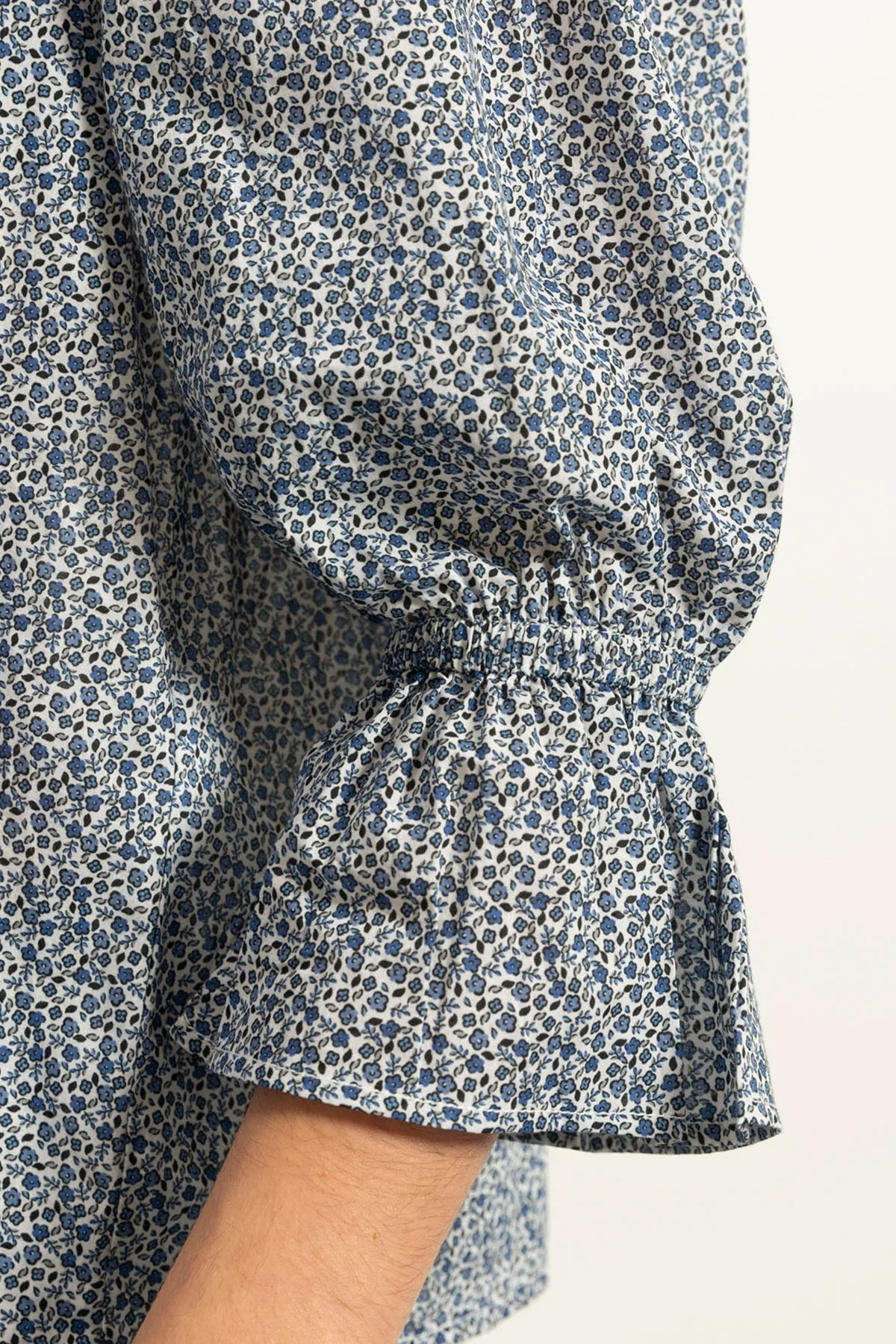 Camisa con estampado floral en azul marino. Abertura frontal con escote en pico y cordones decorativos. Manga tres cuartos con goma ajustada al brazo y volante final.
