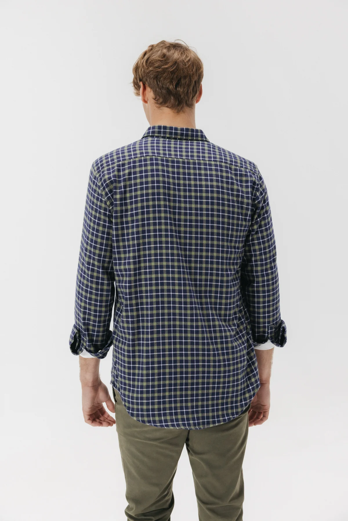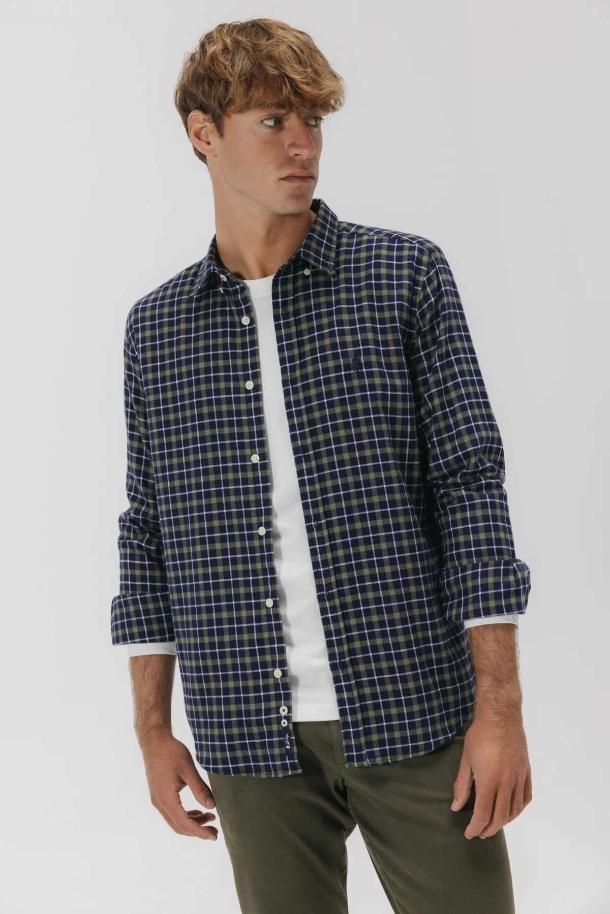 Camisa casual de franela de cuadros confeccionada en 100% algodón en color azul y verde. Cuello botón. Detalle logo a tono en pecho.