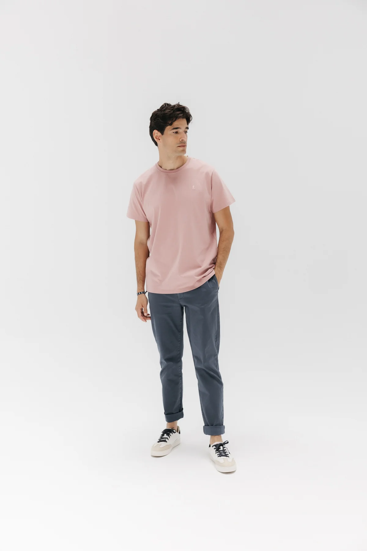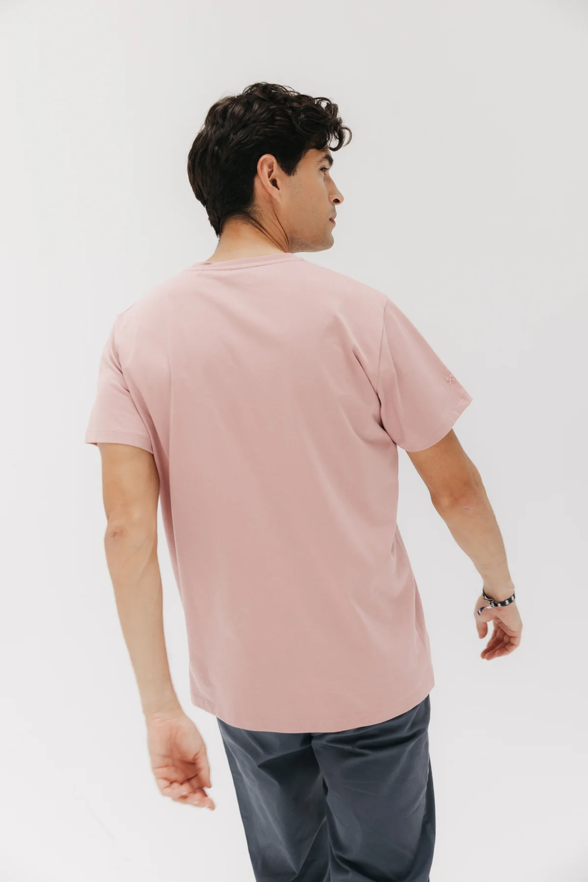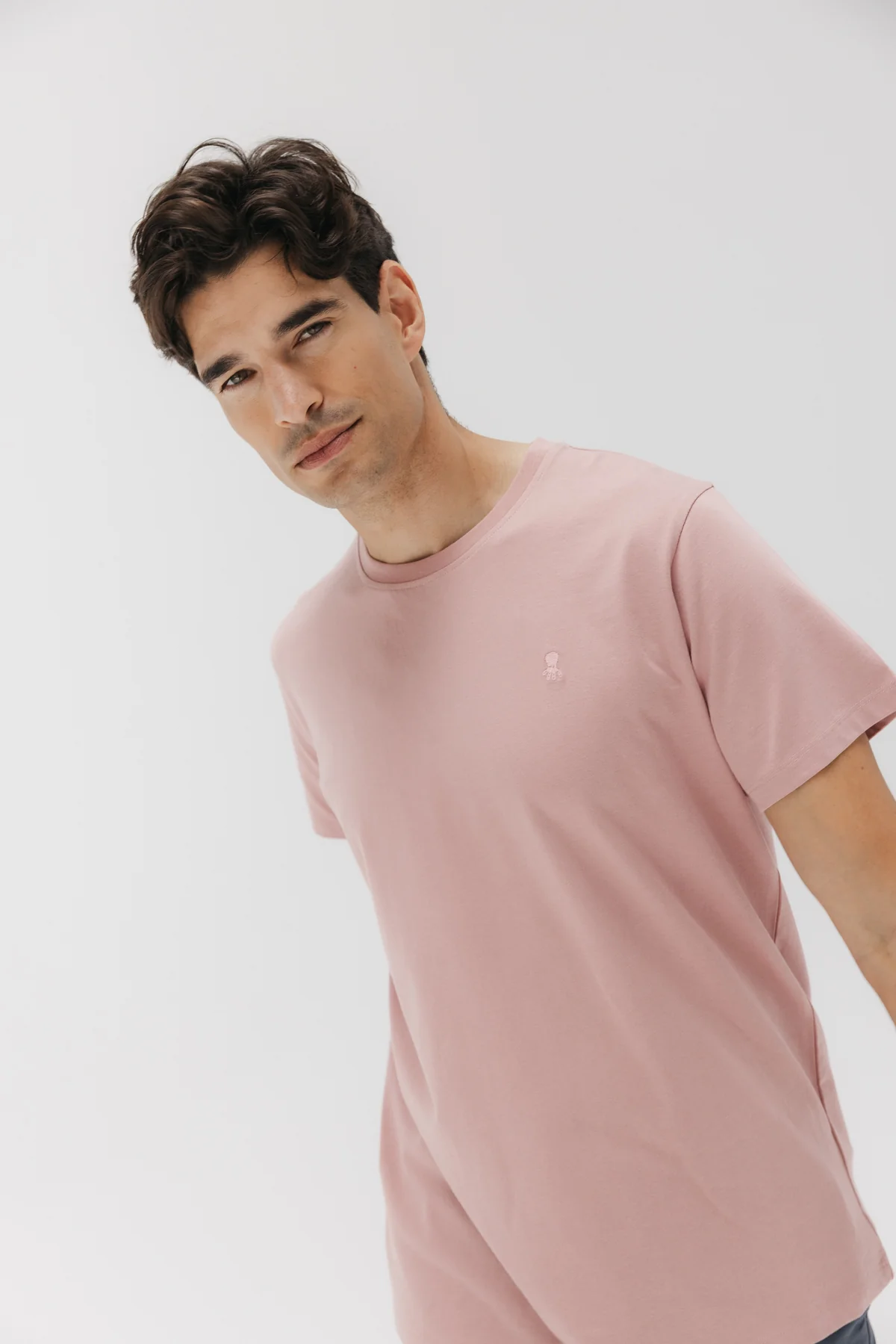 Camiseta manga corta confeccionada en 100% algodón orgánico en color rosa piedra. Logo elPulpo bordado a tono en pecho. Regular fit y cuello redondo. Detalle cruces bordadas a contraste en la manga.