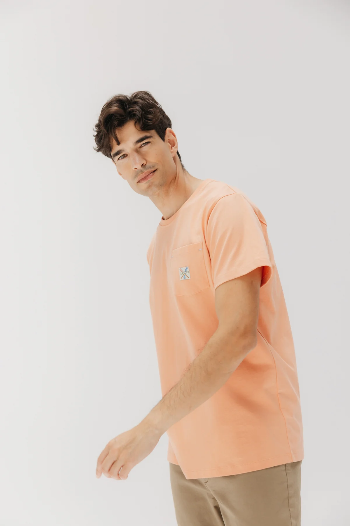 Camiseta manga corta confeccionada en 100% algodón orgánico en color naranja melocotón. Bolsillo en pecho con logo remos. Regular fit y cuello redondo. Detalle cruces bordadas a contraste en la manga.