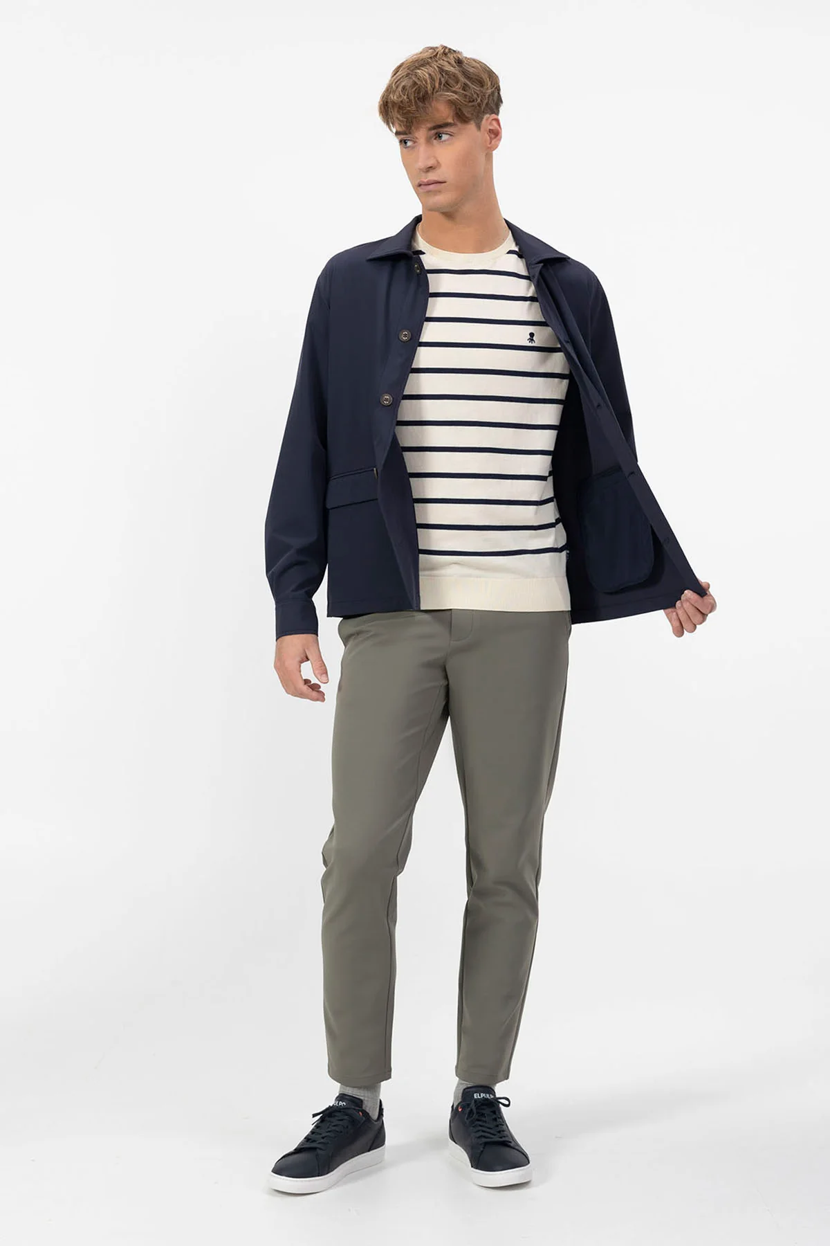 - Camiseta de rayas blanco puro y azul marino.