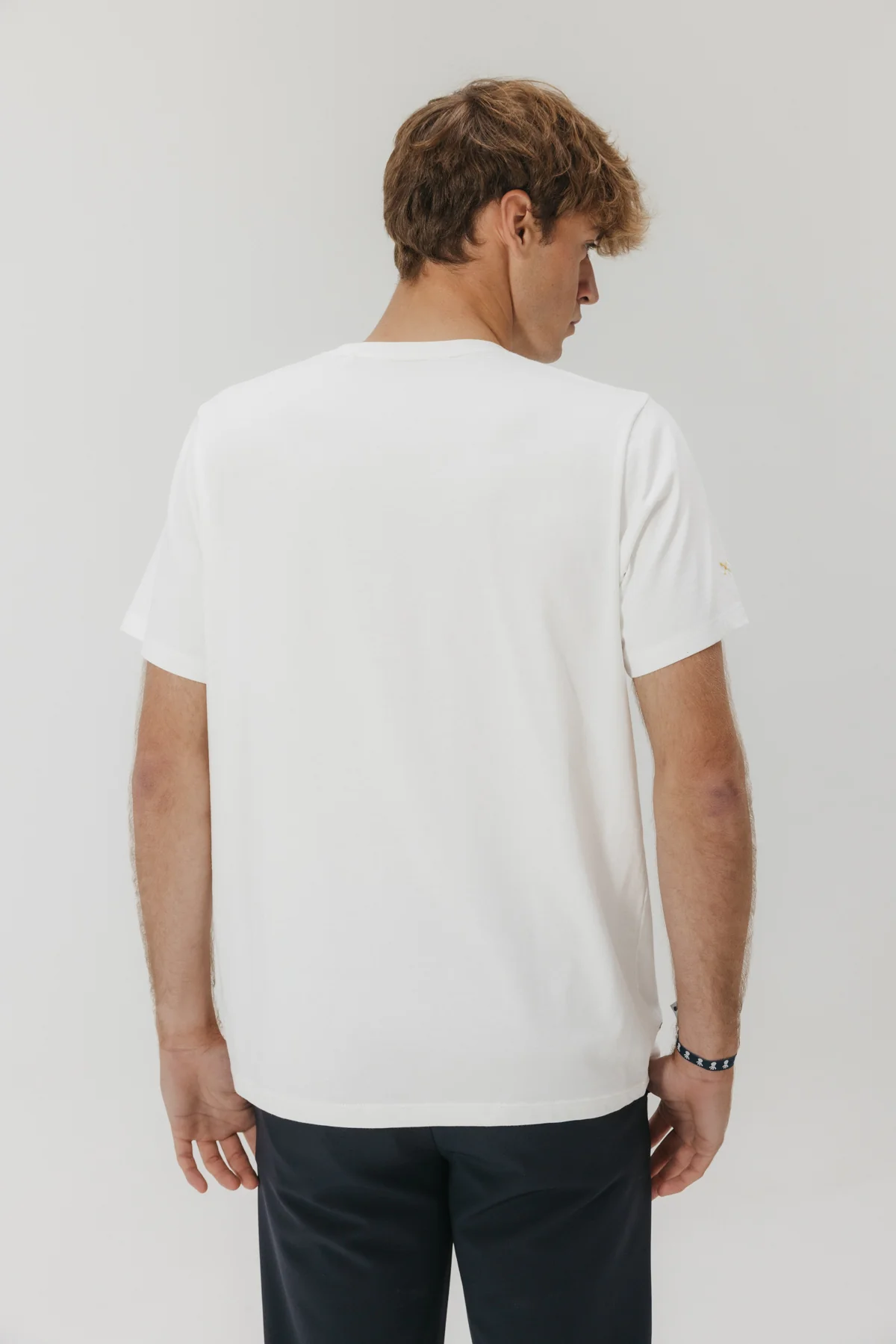 Camiseta de color blanco puro de manga corta confeccionada en algodón orgánico. Cuello redondo y print en el pecho. Regular fit.