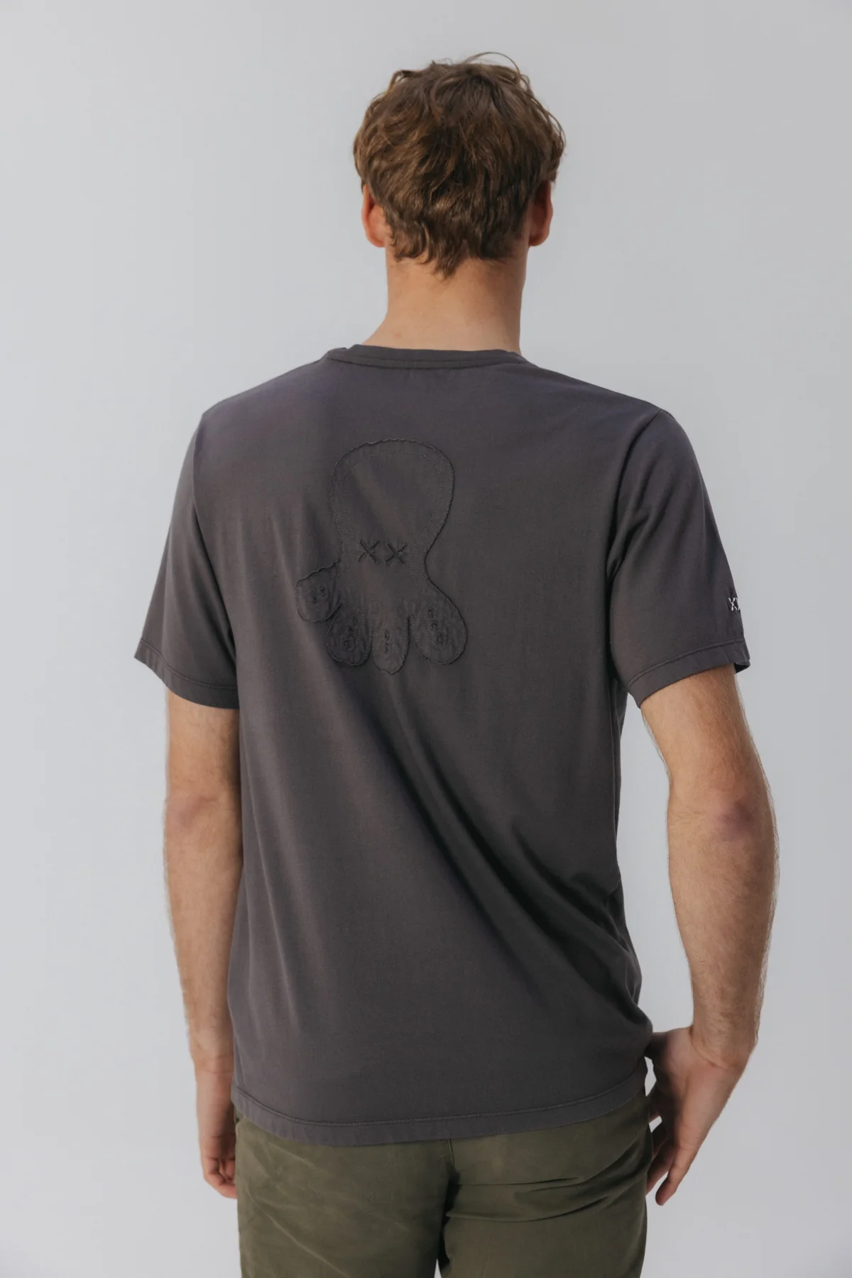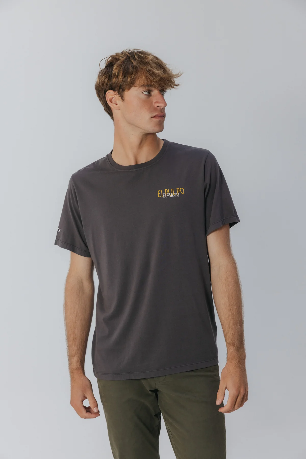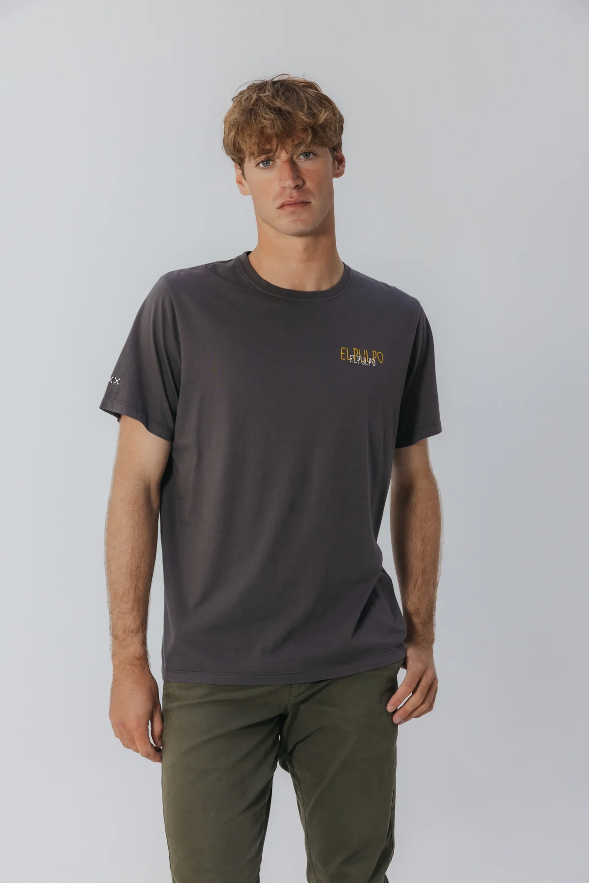 Camiseta antracita de manga corta confeccionada en algodón orgánico. Cuello redondo y logo en la espalda. Regular fit.