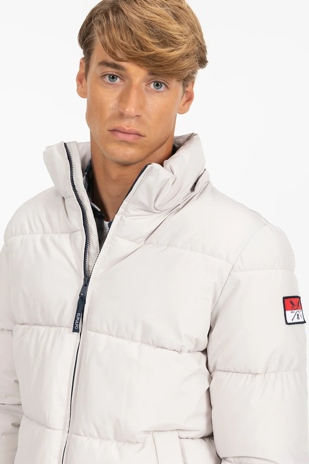 Plumífero corto para hombre en color blanco roto. Capucha desmontable con cordón regulador. Forro de poliéster al contraste y puños con ribs ocultos. Bolsillo interior. Print central en la capucha. Tirador personalizado.
